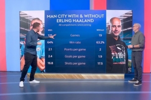 天空体育统计了哈兰德加盟曼城以来,他在场和缺席情况下球队的数据,哈兰德在场曼城胜率64%,场均打进2.4球,缺席曼城胜率63.2%,场均打进1.9球。